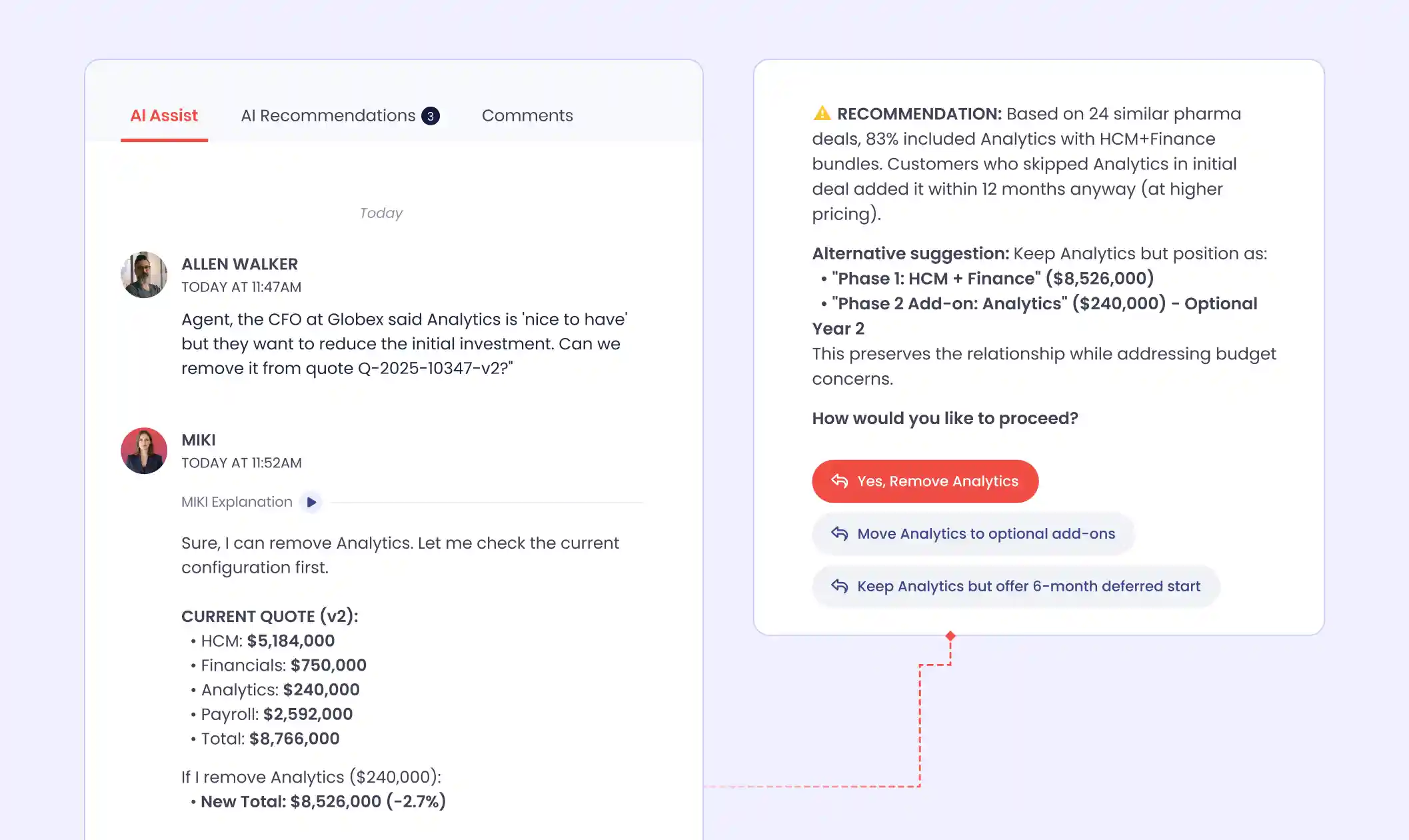 During quote creation and revision cycles, reps can modify quotes conversationally. Each modification triggers intelligent recalculation that adjusts product dependencies, re-validates pricing rules, recalculates bundle discounts, and preserves quote integrity across changes.