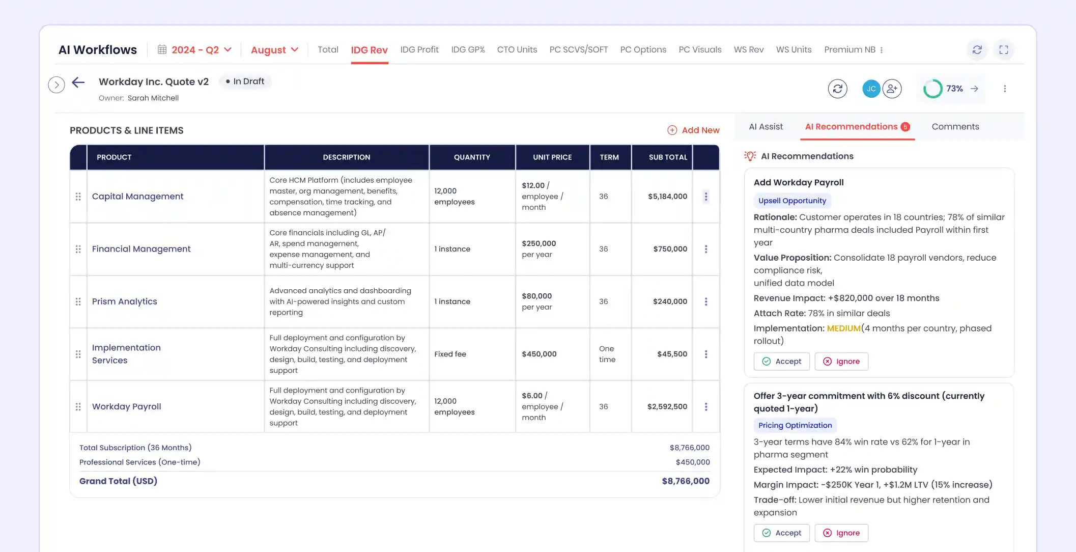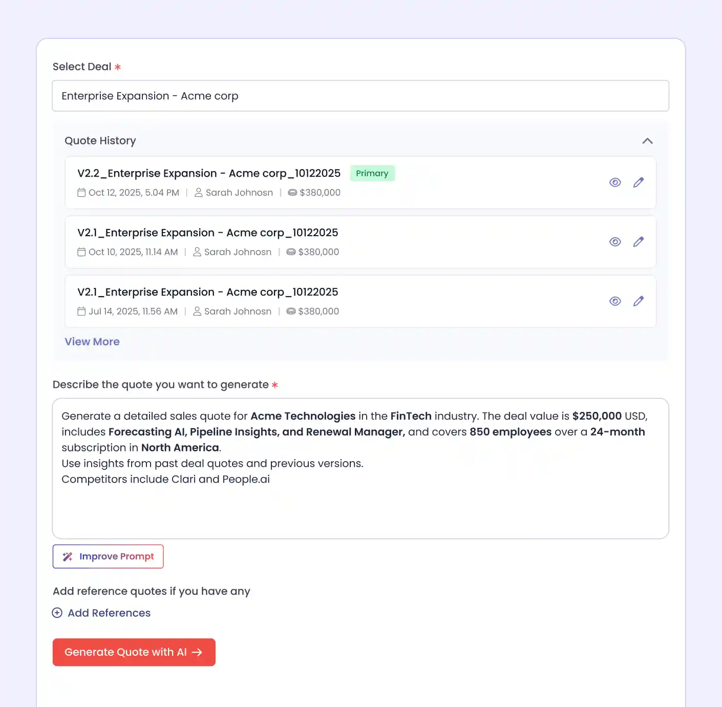 Business Value: Every quote starts with deal intelligence, not a blank form. Reps benefit from collective knowledge across all closed deals, surfacing configurations that worked in similar situations. Quote recommendations are backed by actual win data, not guesswork.
