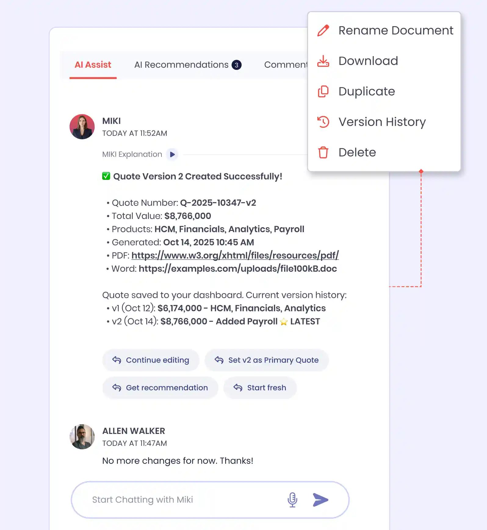 The agent automatically saves every quote modification as a distinct version, maintaining complete revision history without manual file management. Each version preserves the full quote configuration: line items, pricing, terms, discount structures, and approval status.