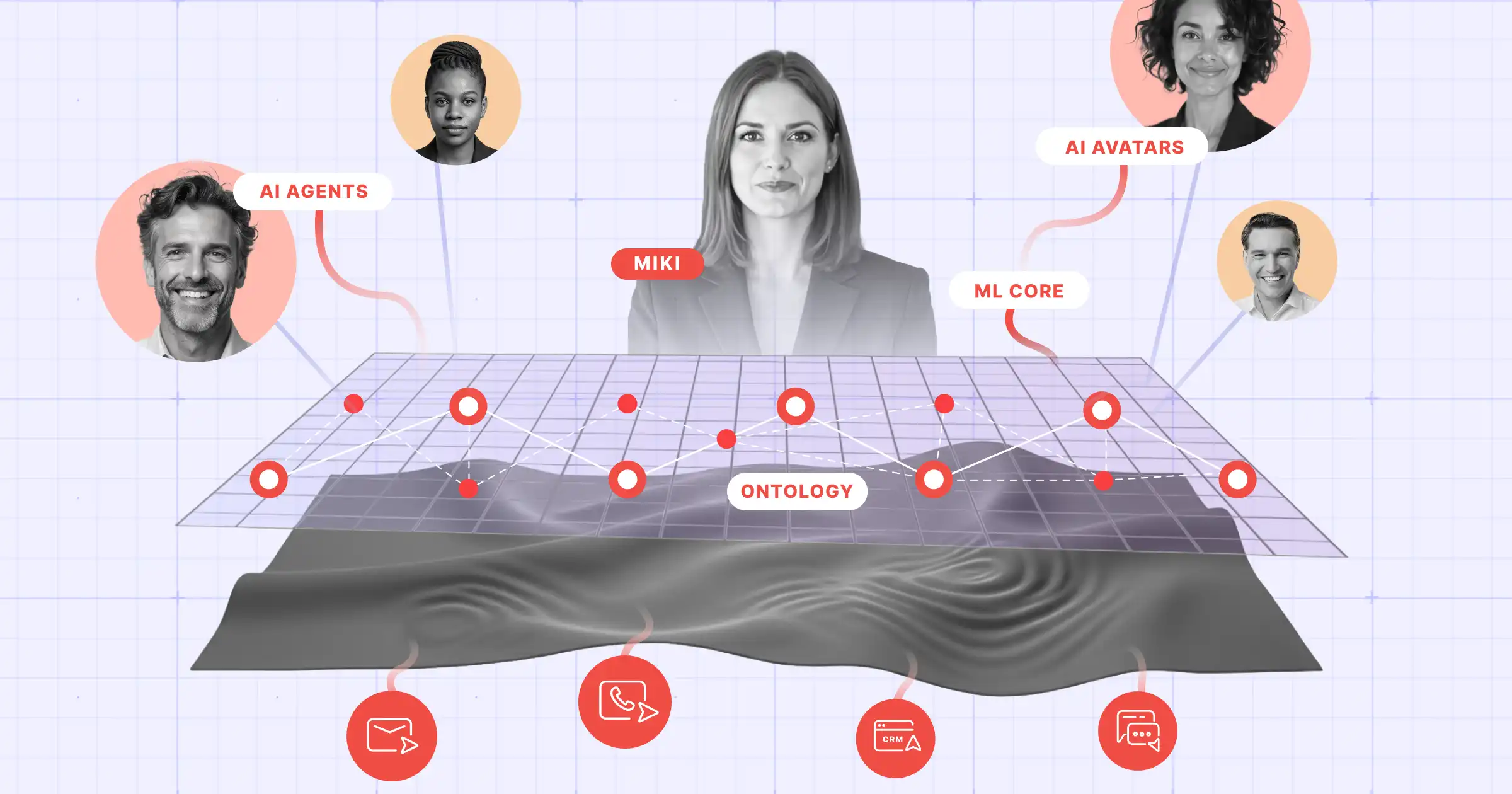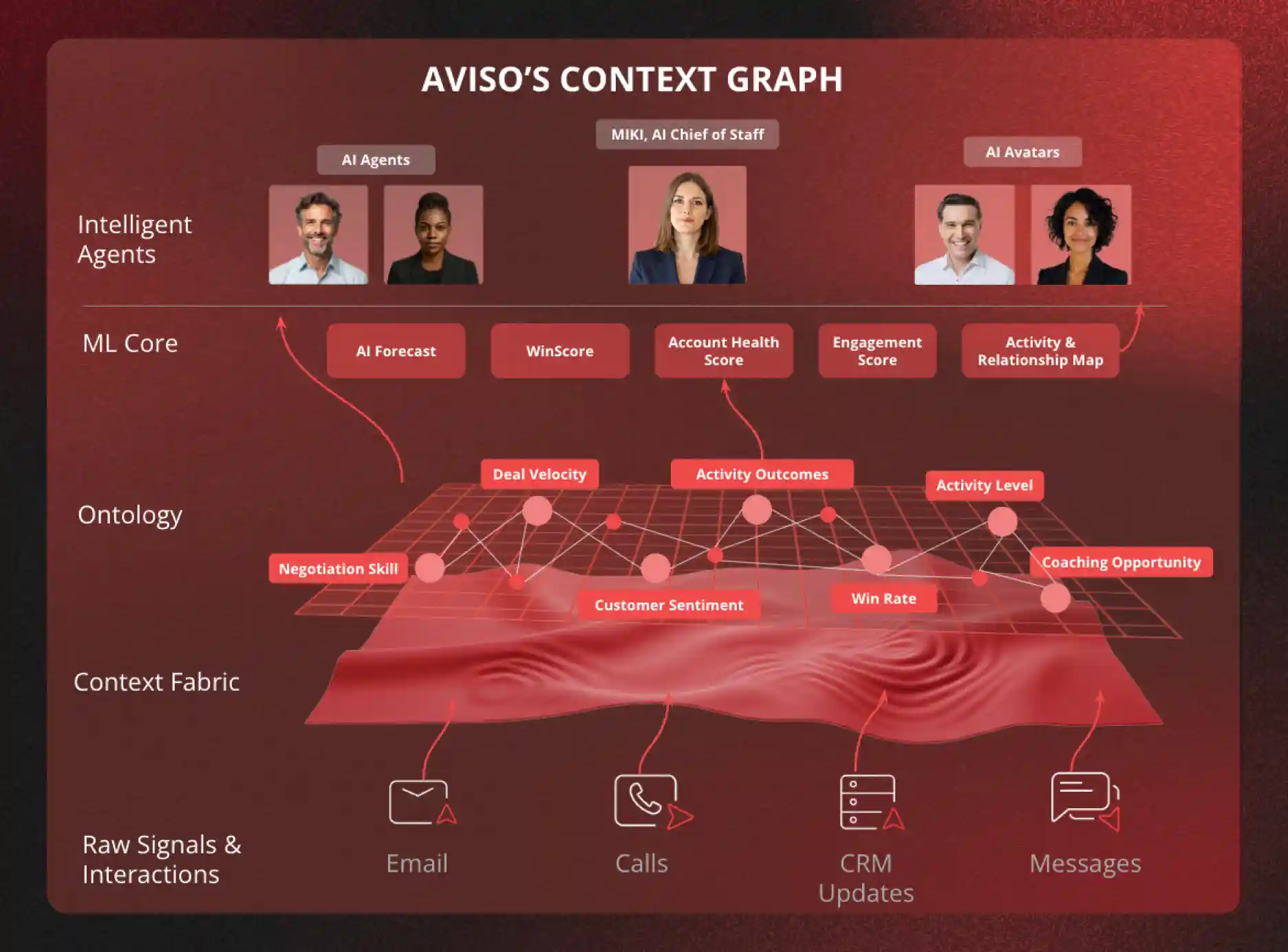 At the top of the Context Graph are Aviso's AI Agents, Avatars, and MIKI, Aviso's Agentic AI Chief of Staff.