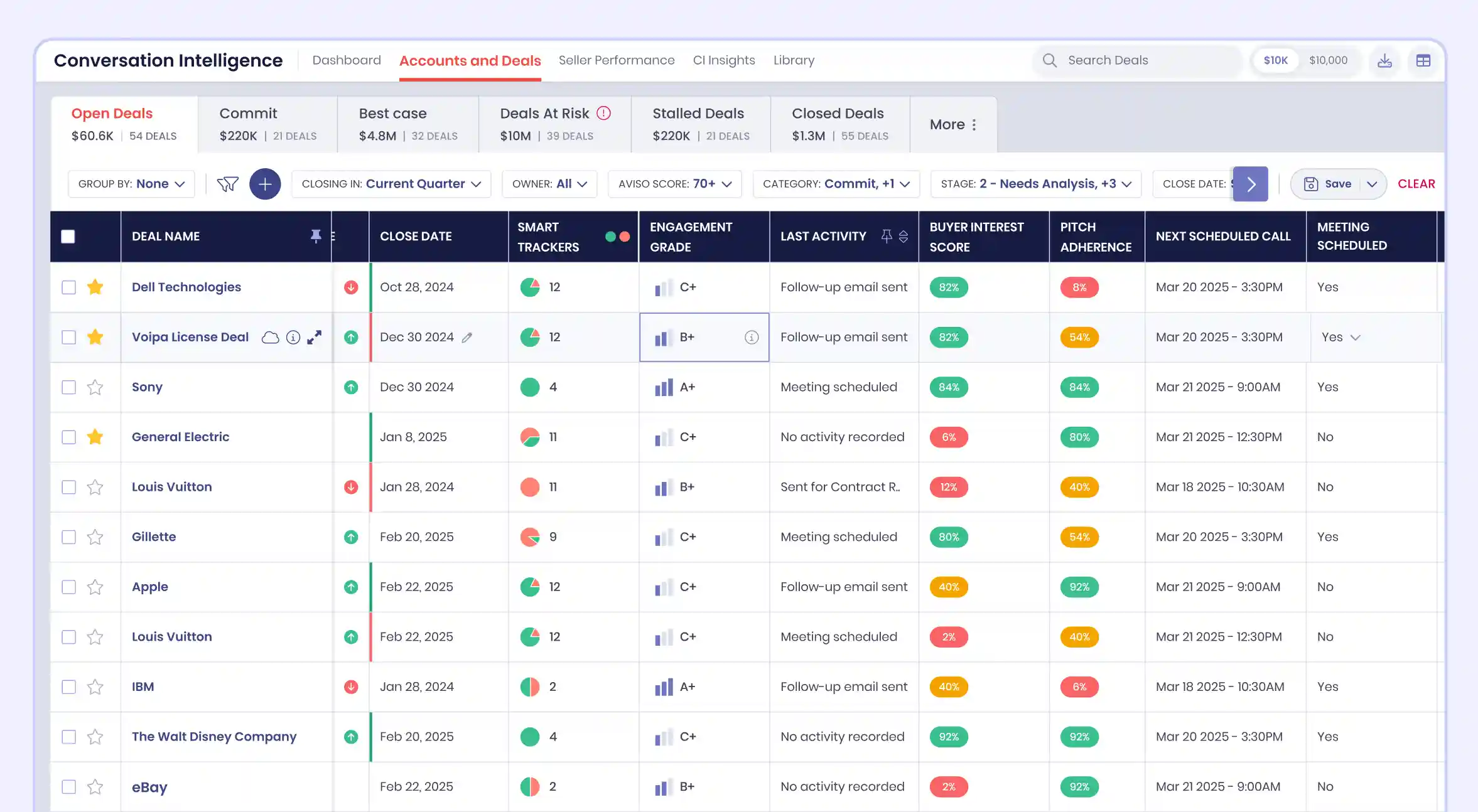 16. Deals Board: WinScore, Engagement Grade, Smart Trackers, MEDDPICC, Buyer Interest Score, and Pitch Adherence on one board