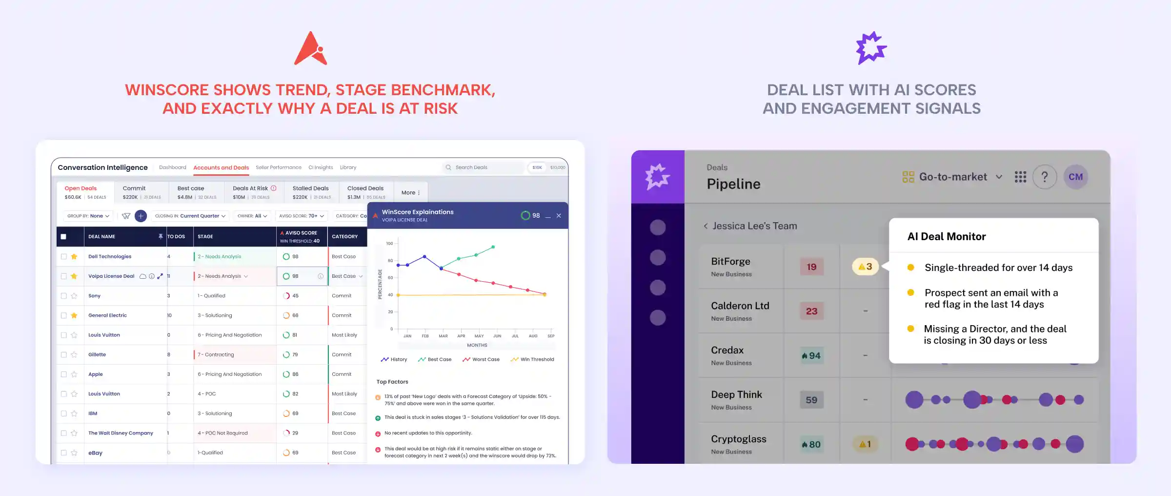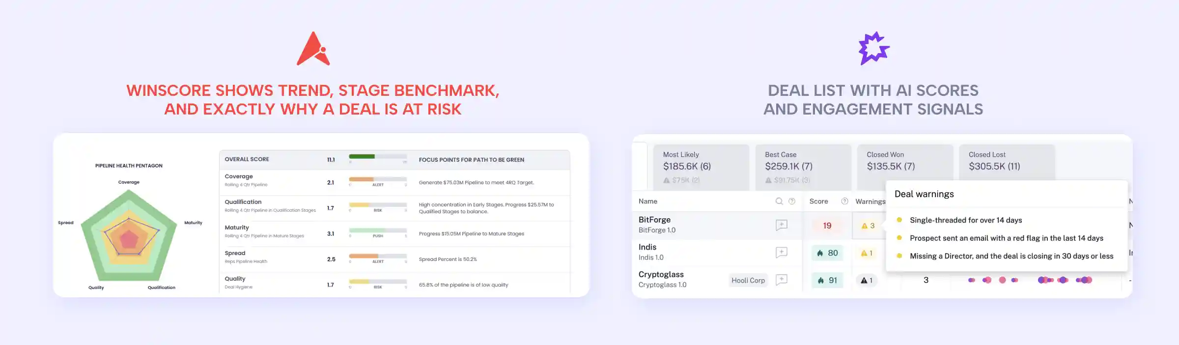 AI risk flags: Identifies deals with engagement gaps, stalled stages, or declining WinScores before they fall out of the forecast
