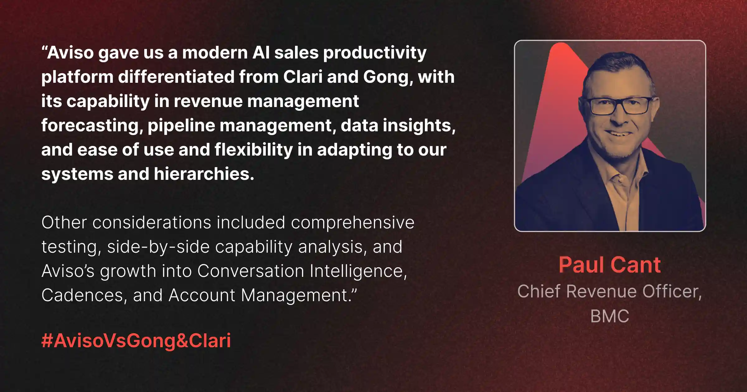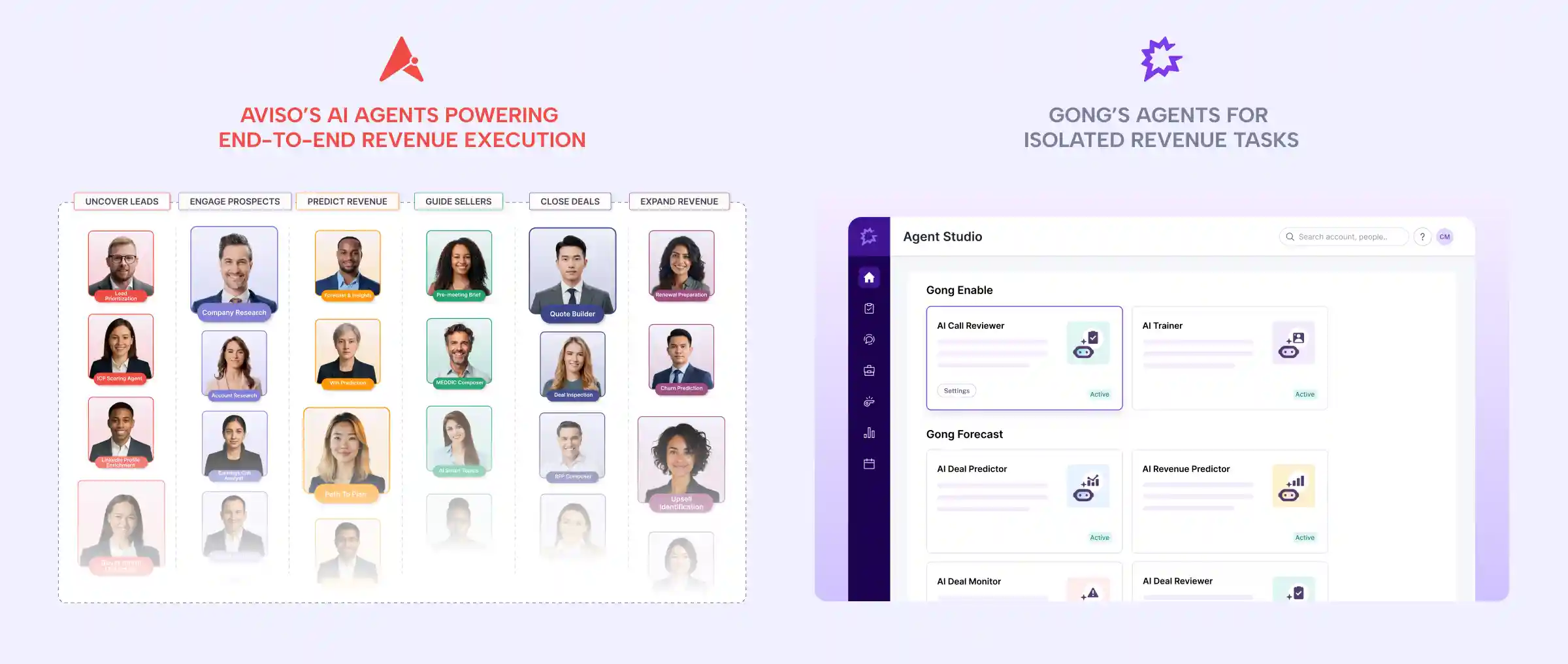 Aviso is an end-to-end revenue platform. It replaces Gong and the tools typically added alongside it, covering forecasting, conversation intelligence, sales engagement, customer success, and coaching in one system. Customers consistently report 50% or more reduction in sales technology spend after consolidating onto Aviso.