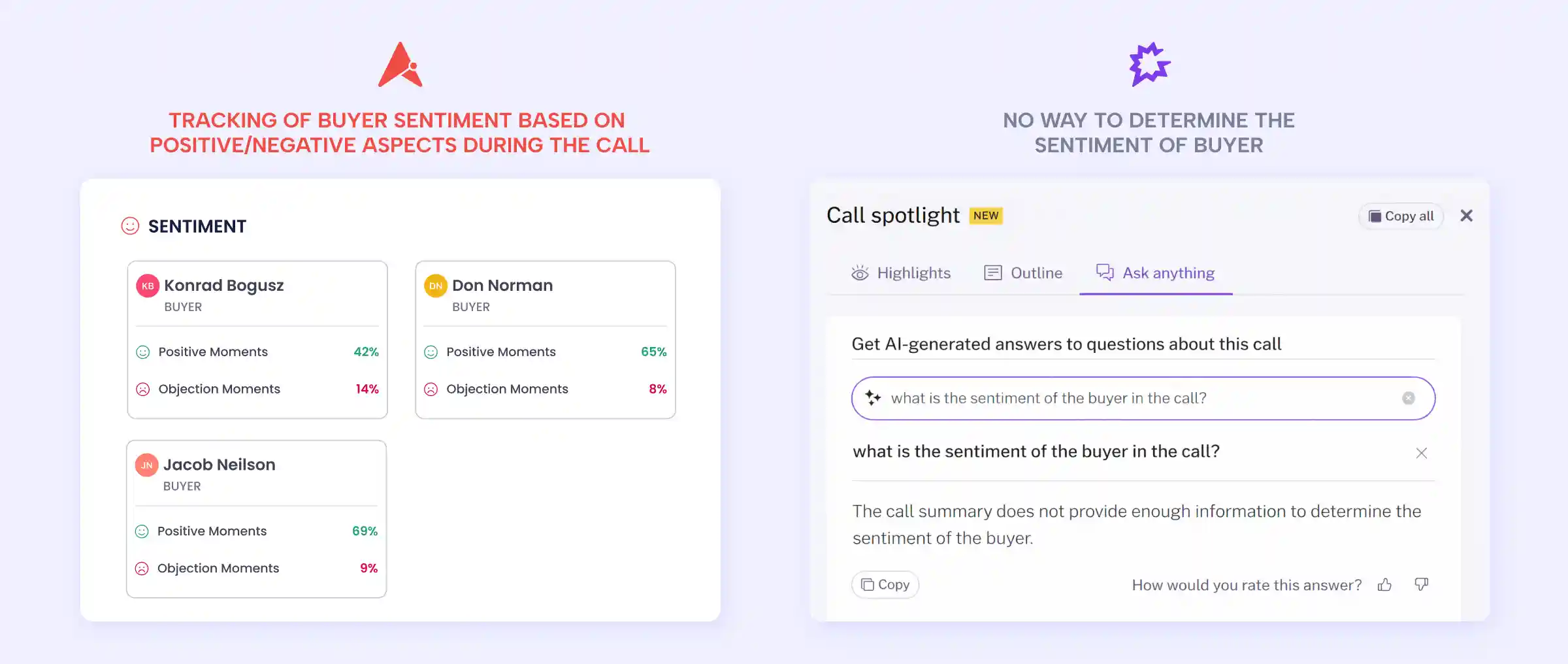 Buyer Intent Signals | 1000+ signals per call across text, voice, and visual layers with DISC profiling | 300+ signals via transcript analysis and Smart Trackers |