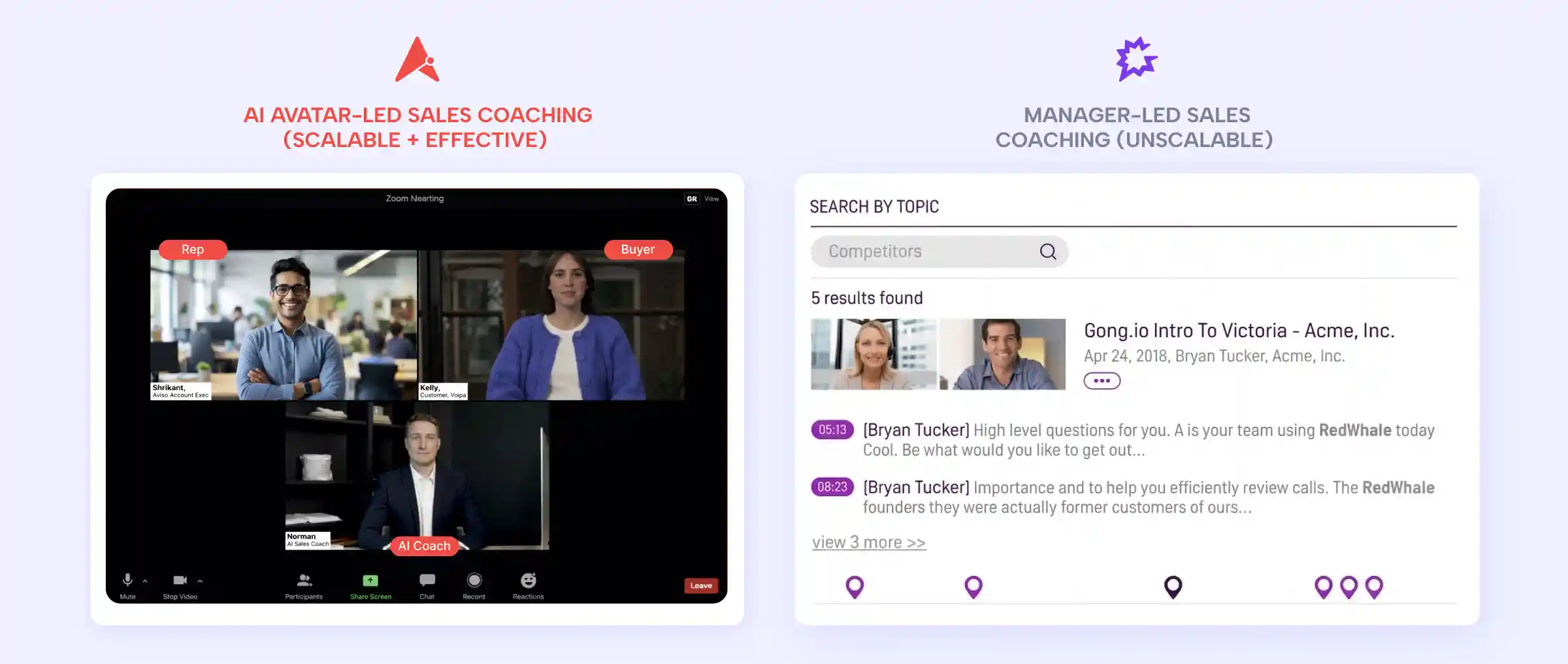 Sales Coaching | AI avatars, certifications, playlists, and buyer-level talk tracks with outcome coaching | AI scorecards, MEDDIC/BANT/SPIN, alerts for objections and competitors |