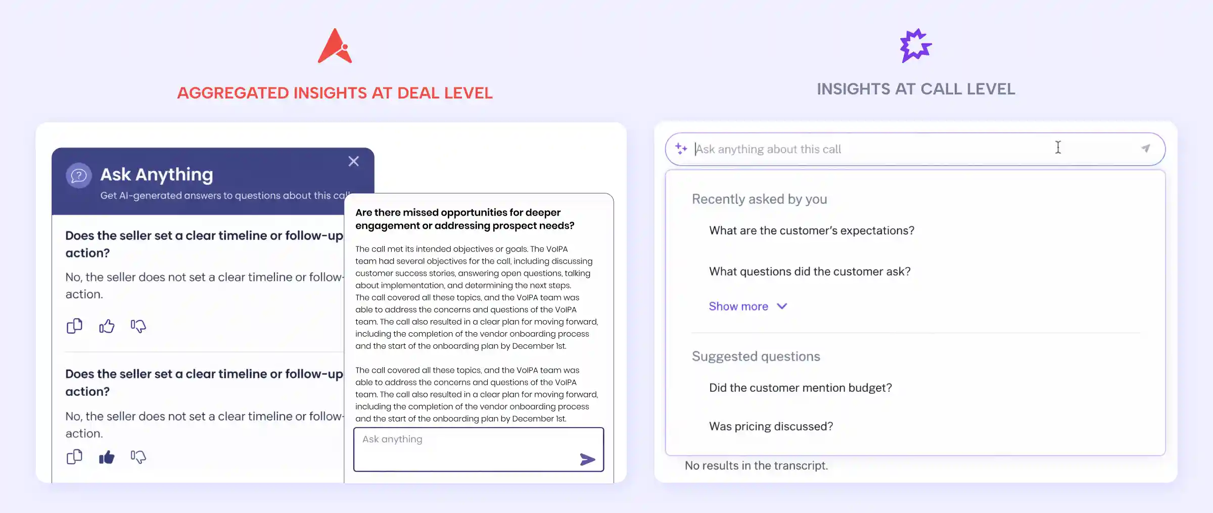 With Gong: Ask Anything queries a single recording. Useful for call review, but context resets with every new call. Connecting patterns across calls to a deal outcome requires the separately licensed Gong Forecast module.