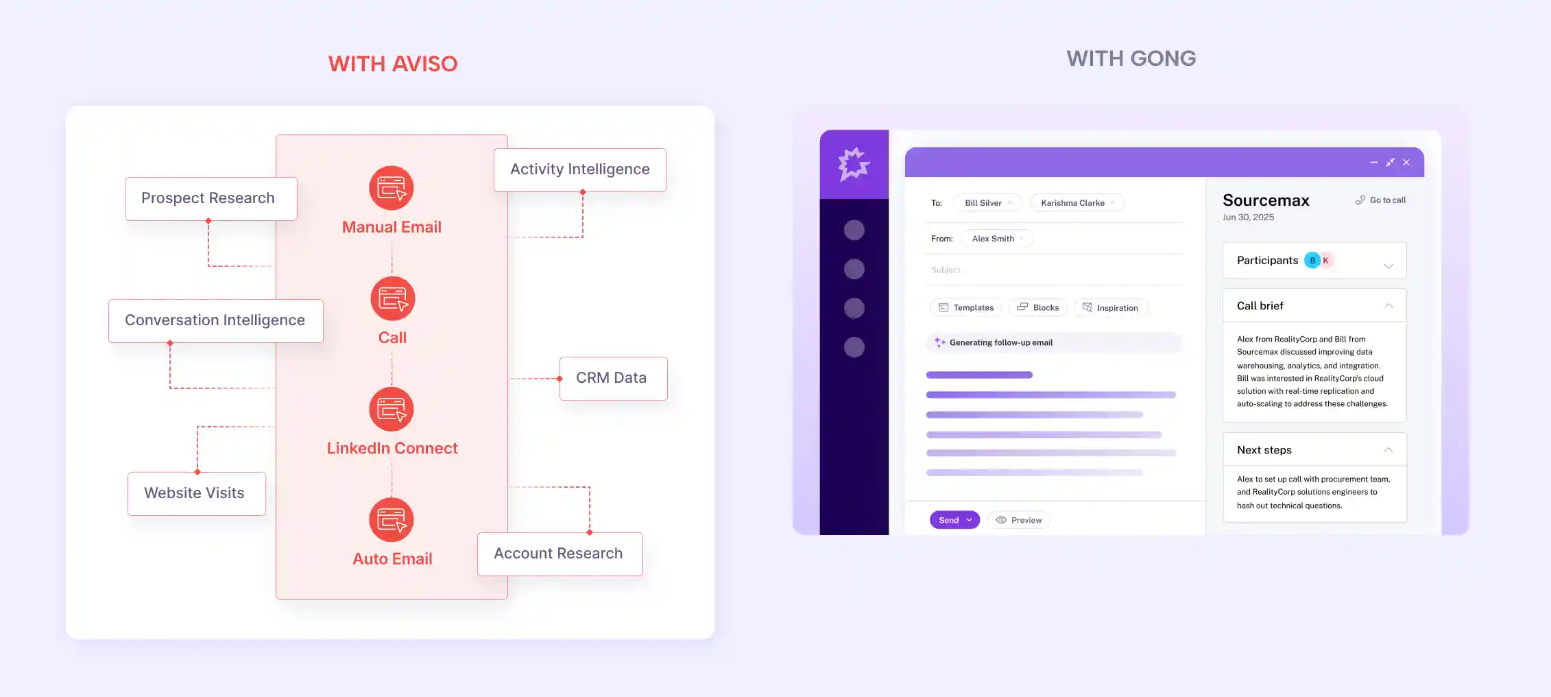 With Aviso: Aviso delivers context-aware outreach. It combines web visits, email/meeting activity, research, CRM data, as well as conversation signals to tailor messaging - ensuring relevant and timely outreach.