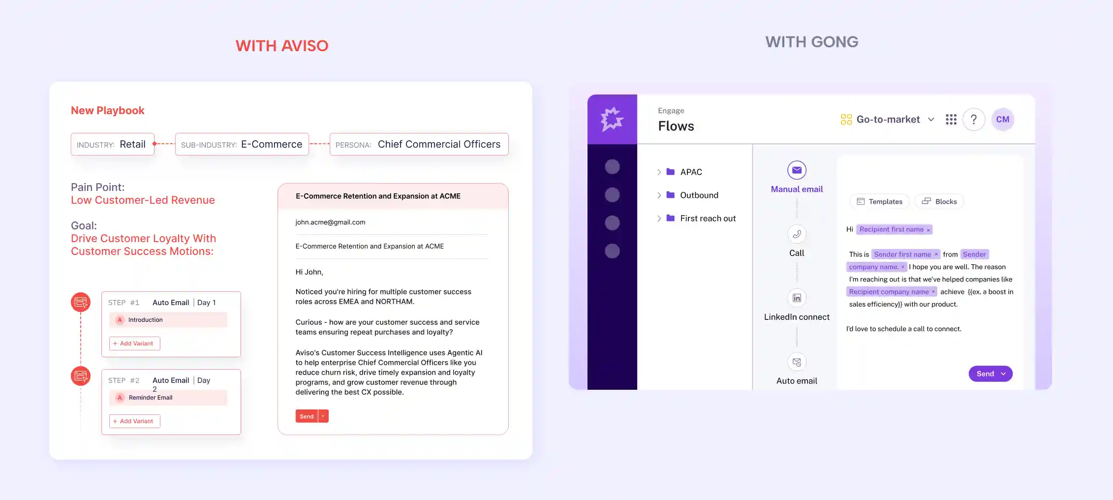 With Gong: Gong offers standard ‘Flows’ which enable consistent, multi-channel outreach but limit personalization.