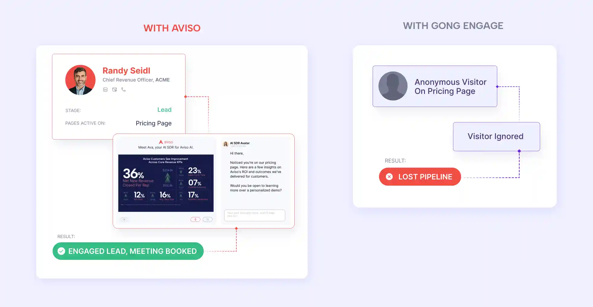 With Aviso: Aviso’s Website Intelligence de-anonymizes accounts on your website and extracts ICP lead profiles. Our AI SDR Avatar then proactively engages these visitors 24x7, answers technical questions via video, voice, and text, overcomes objections, and books meetings without human intervention- driving high speed-to-lead.