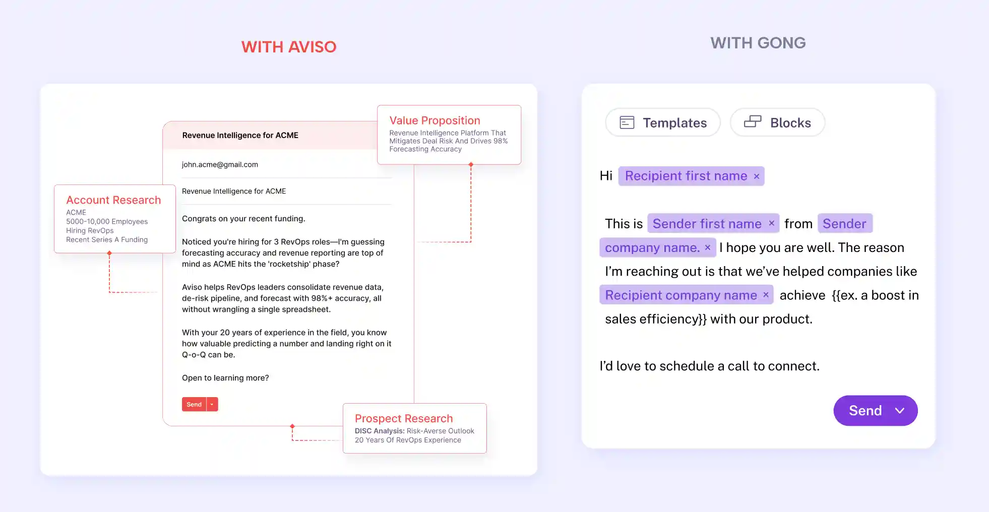Gong’s Flows are built to convert conversations to sales engagement. Aviso’s AI Personalizer takes inputs from Unified Playbooks defined for a specific territory, combines research with your value proposition, conversation insights and activity data, and delivers relevant and timely messaging across multiple channels.
