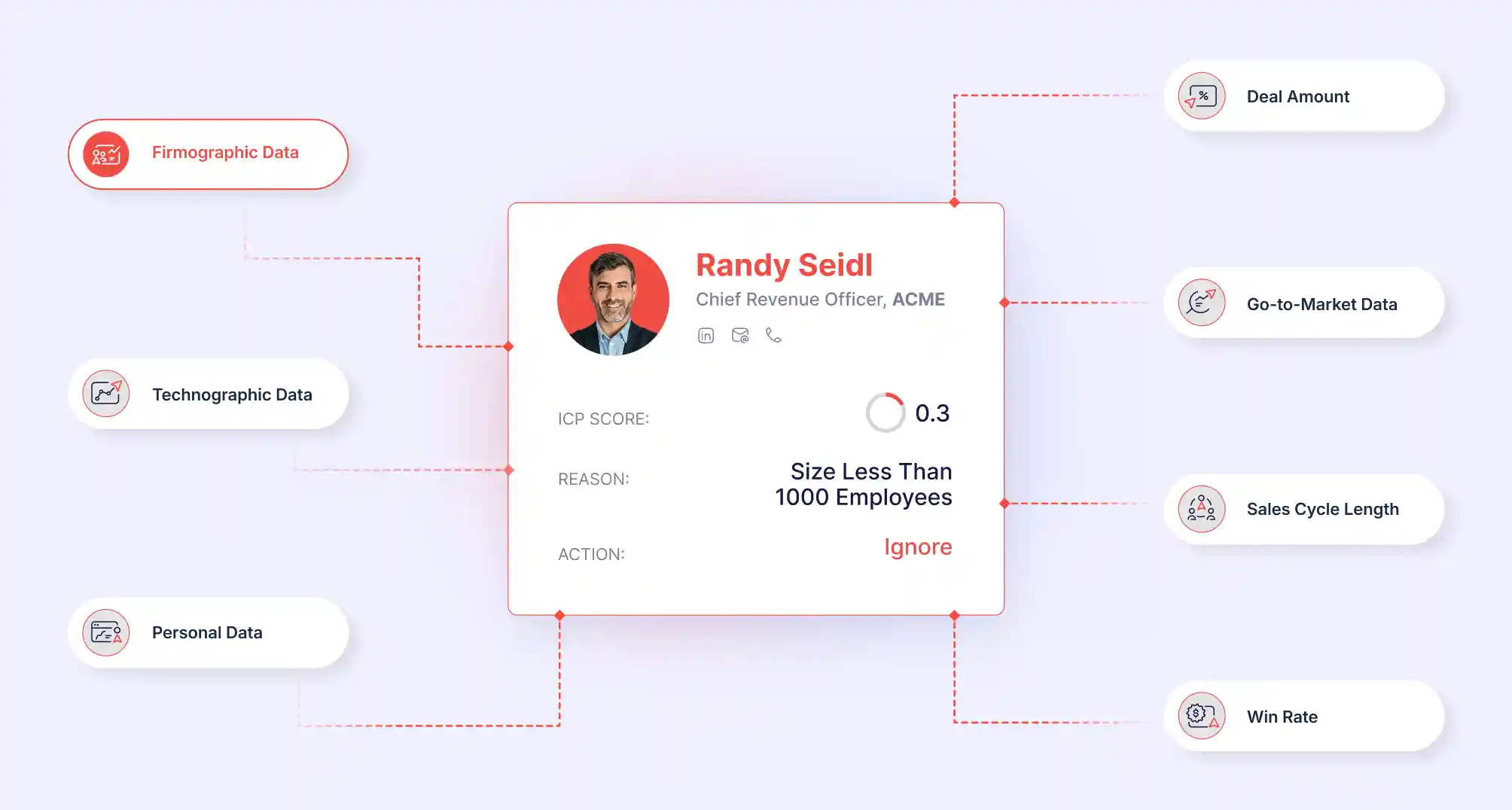 ICP Score: Measures how well the visitor aligns with your successful past deals based on multiple signals (e.g., win rate, cycle length, deal amount, company size, industry, and revenue).