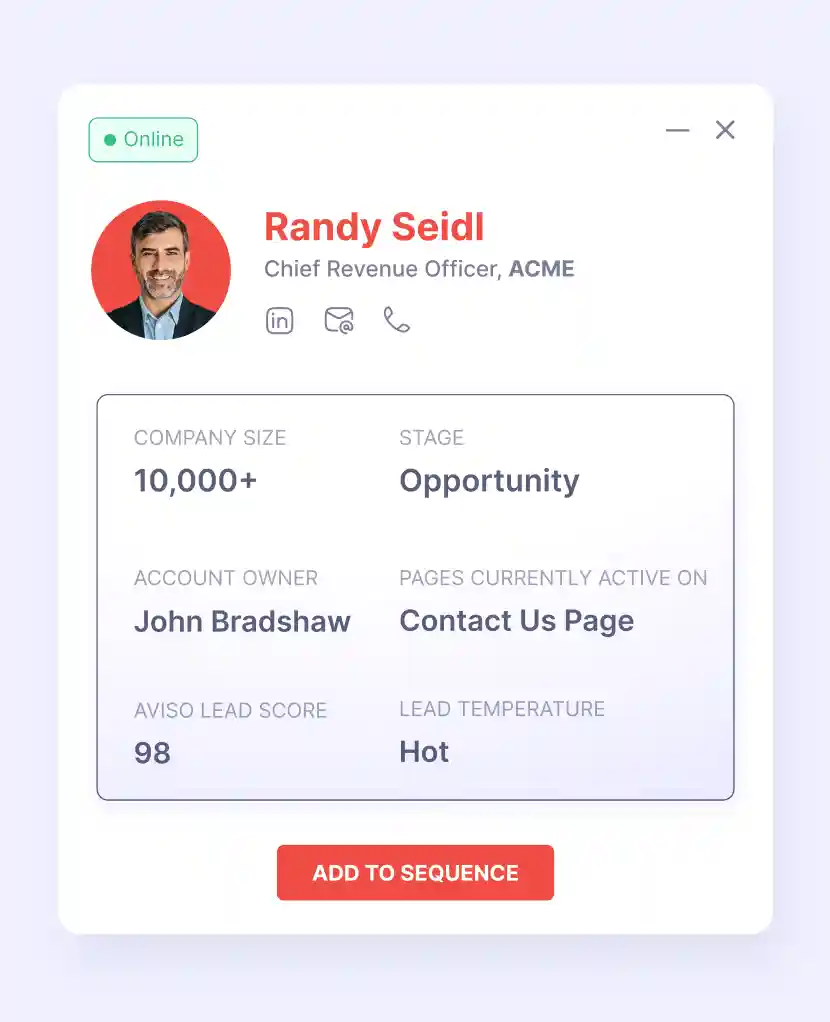 Enrich: Aviso builds out the complete lead profile, filling out missing fields so you have complete contact data and context before you engage.