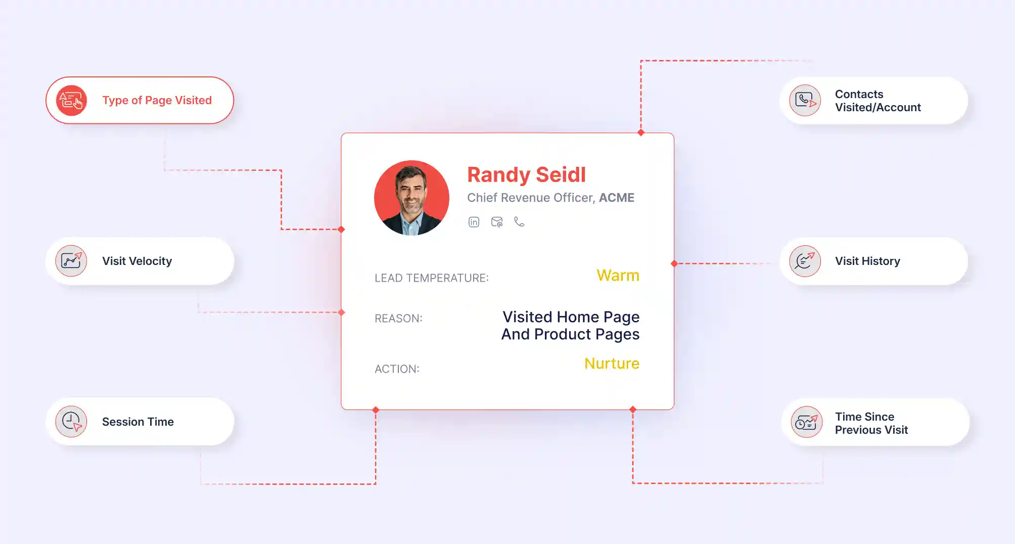 Lead Temperature: A real-time metric based on current website activity, including page depth, page type, session duration, time elapsed since their last visit and more.