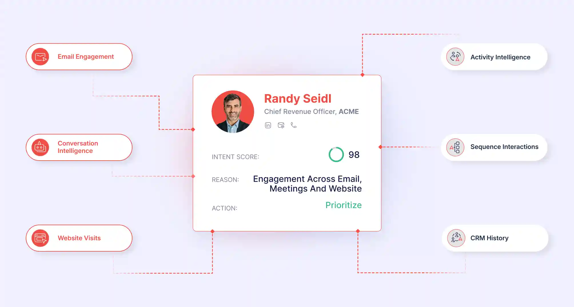Lead Intent Score: Aggregates signals from activity, website visits, conversation intelligence, product usage, sales engagement and CRM history to provide a holistic view of the prospect's journey.