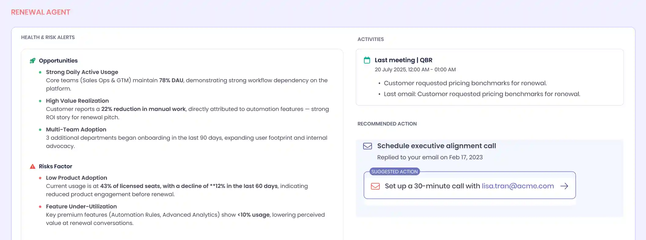 How Aviso Solves It: Our agents maintain a living view of every customer to help CSMs identify expansion opportunities and churn risks while there is still time to act. The system ensures that growth becomes a natural extension of customer value.