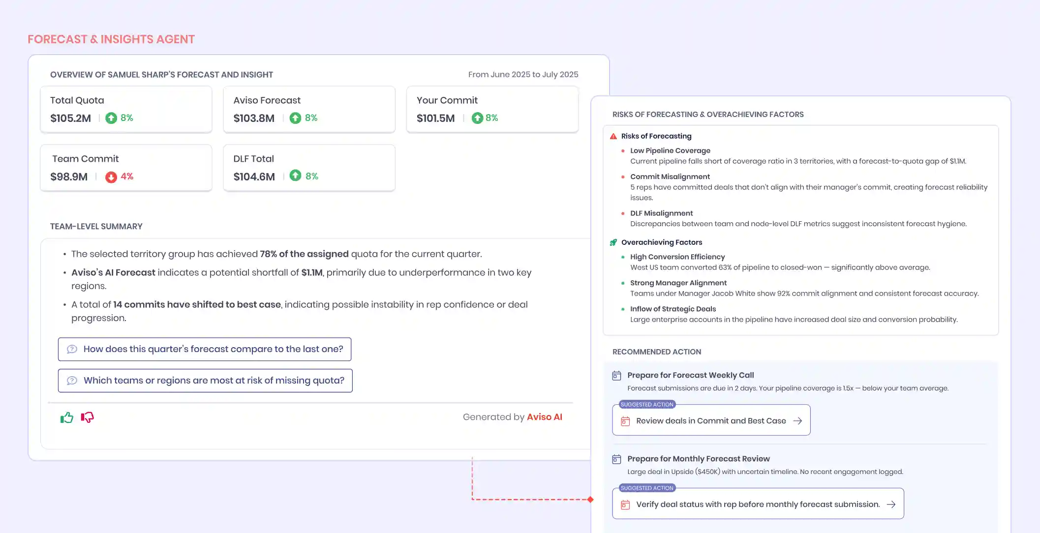 Aviso gives RevOps and Sales leaders a real-time, system-level view of pipeline health and forecast reliability:
