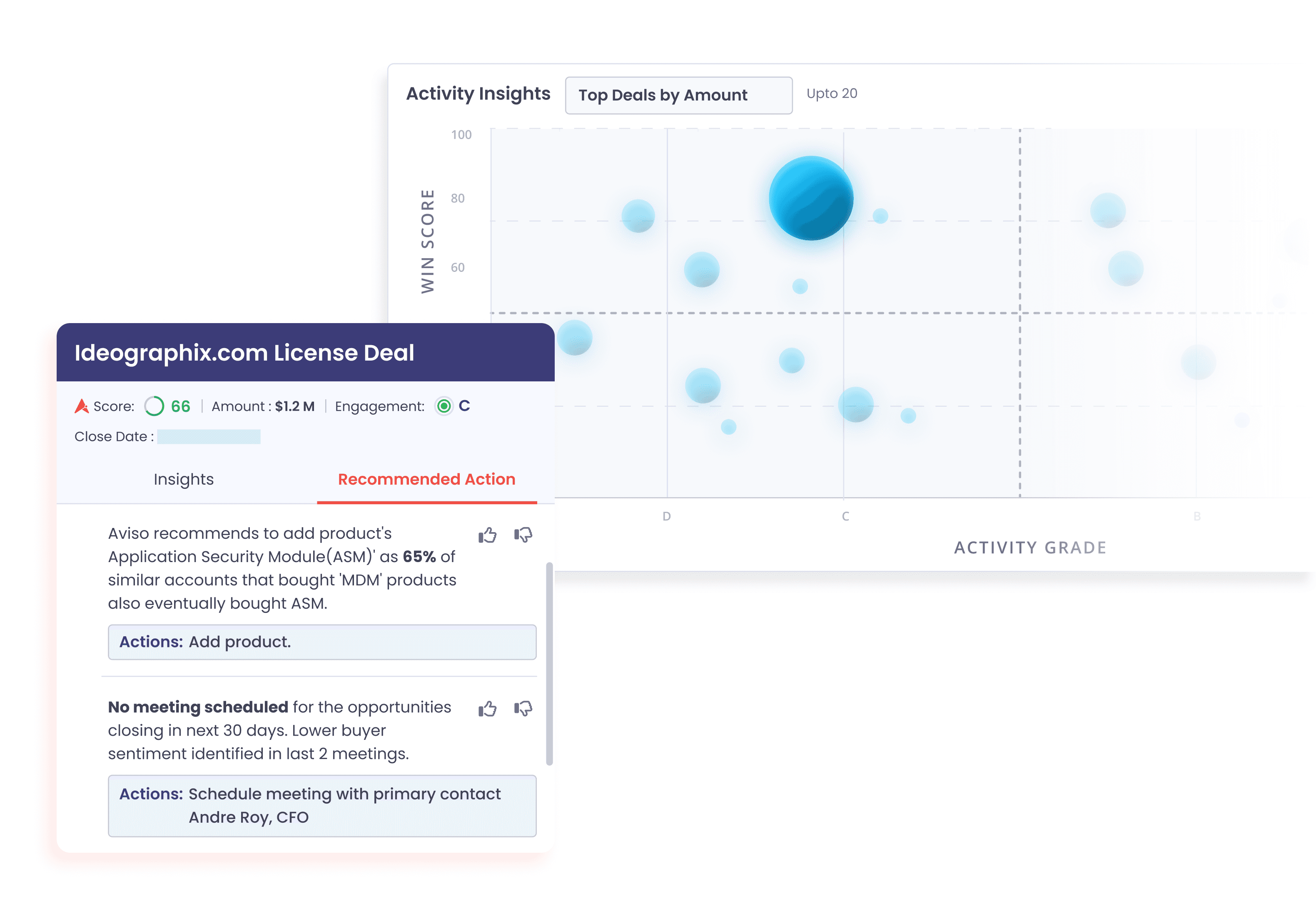 Aviso assigns accurate associations, grades buyer engagement, and connects activity to revenue outcomes, allowing reps to focus on high-priority deals.