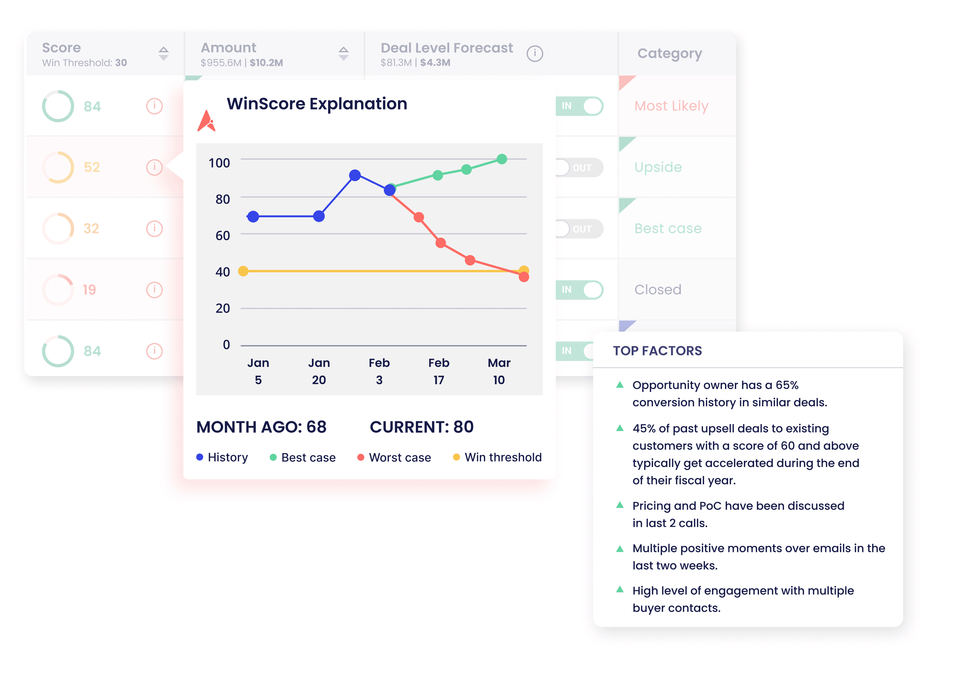 Blend top-down predictive forecasting with bottom-up deal-level forecasting using ‘live’ Opportunity Scores that consider signals from activity, conversation insights, relationships and market dynamics.